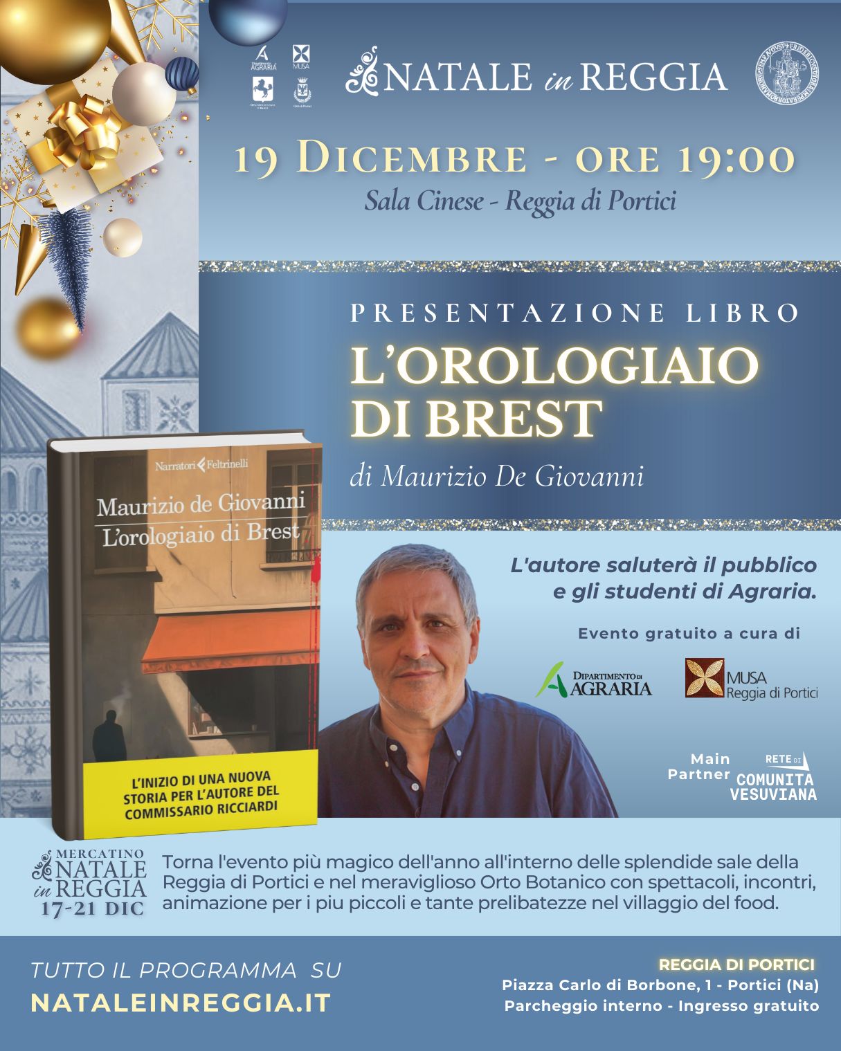 Il 19 Dicembre, la Reggia di Portici ospita Maurizio De Giovanni, autore del Commissario Ricciardi, per la presentazione gratuita de "L'orologiaio di Brest". Un'occasione unica per incontrare lo scrittore nel suggestivo contesto di "Natale in Reggia"